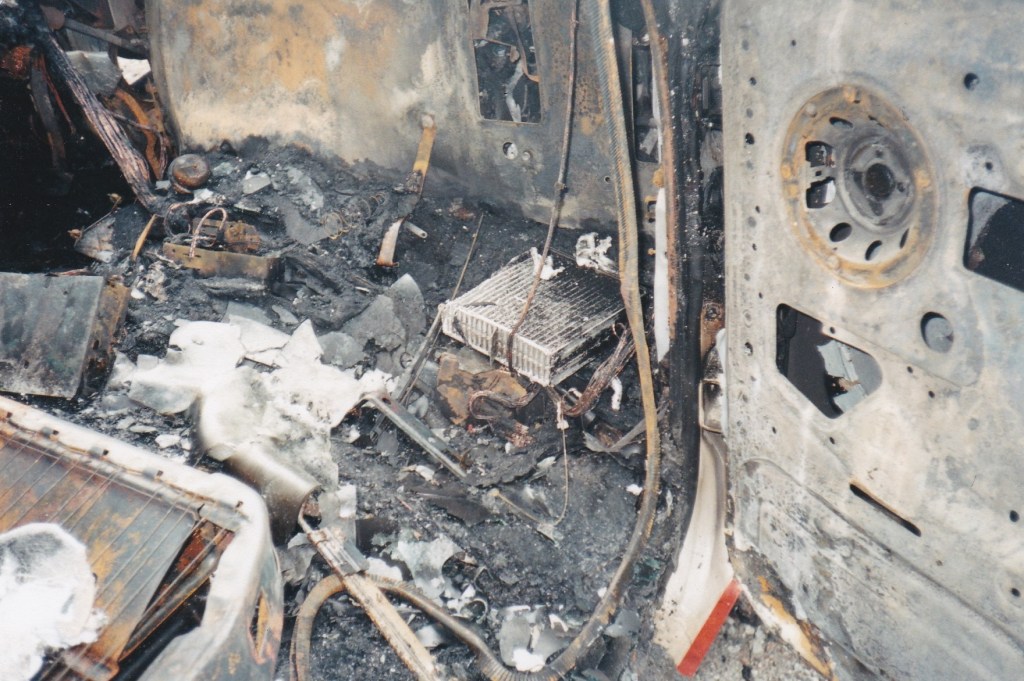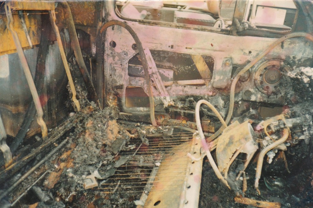 I immediately looked into the rear view mirror and saw a trail of the blackest smoke that I ever saw in my life. It smothered the entire highway. My instinct told me that I had no choice but to jump. When I opened my door, there were flames shooting from under the truck. I did not expect to see fire. I did not look back to see what my friend was doing, I didn’t think about anything but getting out of the truck. As I jumped, I felt tremendous heat on my legs. It felt like I was moving in slow motion. I somehow landed on my feet and stumbled to catch myself. The truck continued to roll. I felt my friend’s arm hug me as we stood and trembled and cried together.